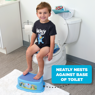 Watch as your little one reaches new heights, with the help of their favorite characters, with this Bluey Step Stool! Building independence starts with growing children taking their first step upward and this step stool is the perfect way to facilitate their growth. The contoured shape of this step stool is ideal for use during potty training as it neatly nests against the base of most adult toilets. Its lightweight design and notched sides make it easy for kids to move it on their own over to the sink for handwashing or teeth brushing. But this stool doesn’t need to just stay in the bathroom, its perfect for use in the kitchen, by their bed, or even as a little seat for reading or playtime. Durably constructed of thick plastic, this step stool is strong enough to hold up to 200 pounds. The surface of the step stool contains skid-resistant TPR, ensuring that your child has a safe and secure footing when in use. Additionally, the base of this step stool contains skid-resistant bumpers to help keep it firmly planted on the ground. When it’s time for growing toddlers to take the next step in their growth, have them do it with Bluey!