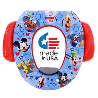 Mickey Mouse can help your little one face potty training with this Mickey Mouse "Hot Diggity Dog" Soft Potty Seat! There’s no better way to encourage your child to start using the adult toilet than by bringing in their favorite characters. This cute and colorful potty seat is made in the USA with durable plastic, heavy-duty vinyl, and a soft foam core that holds up over time. The Patented, Easy Grip Handle design helps your little one feel safe & secure on the toilet and aids in building independence throughout the potty training process. This soft, cushioned seat is a welcome alternative for children to use versus hard plastic ones. All components come apart for an easy clean that gets every inch. These seats are a safe option all around as they are both BPA & Phthalate-Free! This potty seat fits on most regular & elongated toilet seats so it is ready to use anywhere in the house.