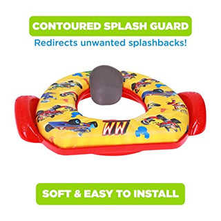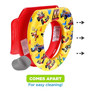 Mickey Mouse can help your little one face potty training with this Mickey Mouse "Track Adventures" Soft Potty Seat! There’s no better way to encourage your child to start using the adult toilet than by bringing in their favorite characters. This cute and colorful potty seat is made in the USA with durable plastic, heavy-duty vinyl, and a soft foam core that holds up over time. The Patented, Easy Grip Handle design helps your little one feel safe & secure on the toilet and aids in building independence throughout the potty training process. This soft, cushioned seat is a welcome alternative for children to use versus hard plastic ones. All components come apart for an easy clean that gets every inch. These seats are a safe option all around as they are both BPA & Phthalate-Free! This potty seat fits on most regular & elongated toilet seats so it is ready to use anywhere in the house.