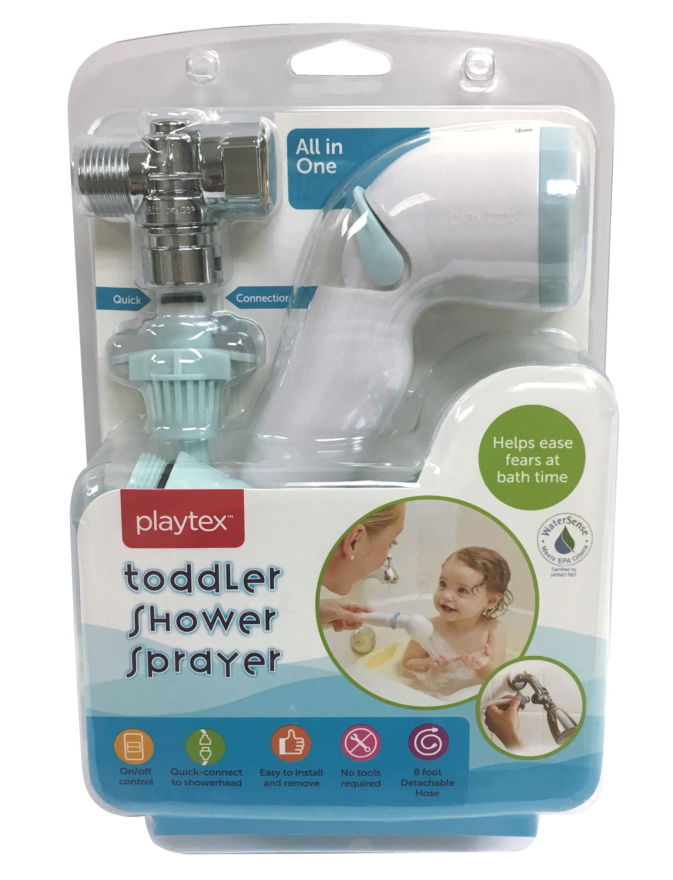 The Playtex Toddler Shower Sprayer is an ideal solution to make bathing easy for parents. Personalization is built into this sprayer's design; it features a variable-flow sprayer setting that can easily be adjusted. The pause lever on the head of the sprayer aids in quickly turning the water flow on and off when in use. The Patented, Quick Connect design of this hose allows it to easily be snapped on to the showerhead for bathing. Installation is so simple- all components and instructions are included and no tools are required! The detachable 8-foot hose is flexible, allowing it to stretch to where it is needed in the shower or bath.